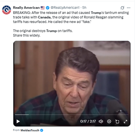 다만 CNN은 광고에 사용된 레이건 전 대통령의 연설이 편집된 것은 맞지만 가짜는 아니라고 설명했다. 해당 연설은 1987년 4월 25일 이뤄진 5분 가량의 라디오 연설로, 실제 관세를 비판하고 자유롭고 공정한 무역을 지원한다는 내용이 골자다.