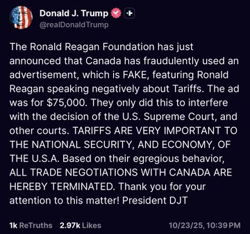 트럼프 대통령은 23일 밤 소셜미디어(SNS) 트루스소셜에 “캐나다의 악의적 행동에 근거해, 캐나다와의 모든 무역 협상을 즉시 종료한다”고 밝혔다.