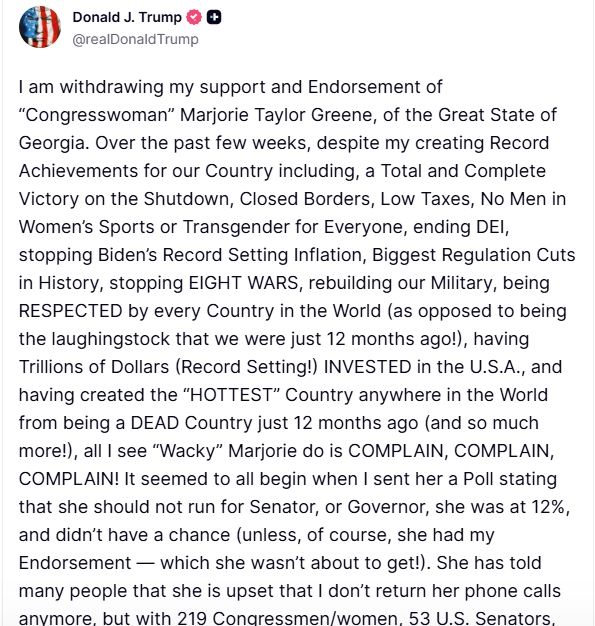 그린은 2020년 선거전 이후 트럼프의 가장 극렬한 지지자였고, 트럼프는 그녀를 “미래의 공화당 스타”, “진정한 승리자”라 칭송해왔다. 백인우월주의 논란부터 총기확산 발언까지, 그린의 극단적 행보에도 트럼프는 일관된 방패였다.