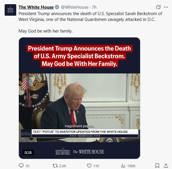 트럼프 대통령은 사망 군인 세라 벡스트롬의 소식을 직접 밝히며 이번 사건을 “수도에서 벌어진 테러 공격”, “극악무도한 괴물의 소행”으로 규정했다. 라칸왈의 가족을 추방하는 방안도 검토 중이라는 설명이다.