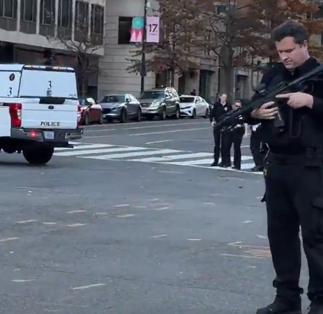 워싱턴 D.C. 도심에서 국방부 소속 내셔널가드 요원 2명이 총격을 받았다는 신고가 접수된 직후, 무장한 경찰들이 현장을 통제하며 수사를 진행하고 있다. 경찰 차량이 교차로를 봉쇄한 가운데, 주변 시민들은 인도를 따라 대기하며 상황을 지켜보고 있다. (사진 출처: FAFO @McGregn X 캡처)