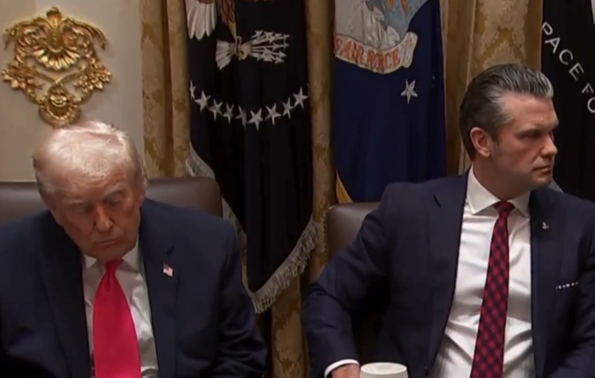 도널드 트럼프 대통령이 2일 백악관에서 열린 국무회의 중 고개를 숙이며 피트 헤그세스 국방장관 발언을 듣고 있다.[U.S. Commerce Dept.@CommerceGov]