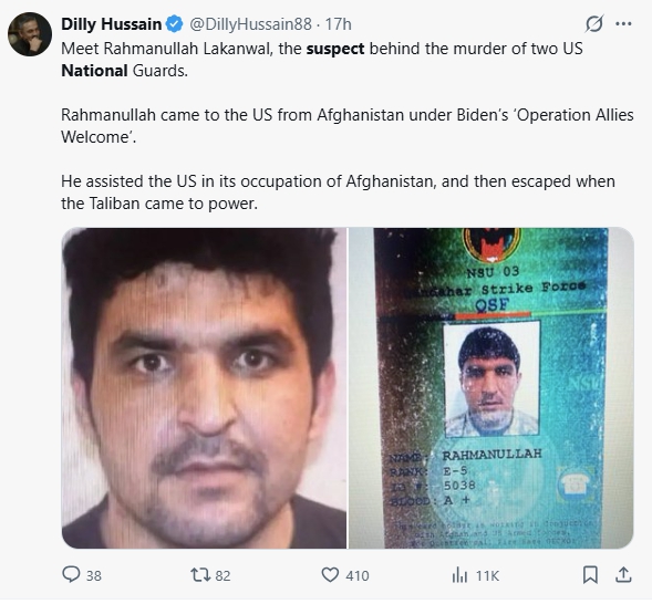 앞서 아프가니스탄 출신 이민자 라마눌라 라칸왈은 지난달 26일 오후 워싱턴DC 백악관 인근 지점에서 웨스트버지니아 주방위군 소속 앤드루 울프 공군중사, 세라 벡스트롬 육군상병에게 총격을 가했다. 벡스트롬 상병은 다음날 사망했고 울프 중사는 중상을 입었다.