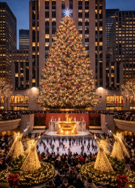 뉴욕 맨해튼 록펠러 센터에서 크리스마스를 맞아 대형 크리스마스 트리가 점등돼 방문객들과 스케이터들로 붐비고 있다. 황금빛 조명과 아이스링크가 어우러지며 연말 분위기를 자아내고 있다.