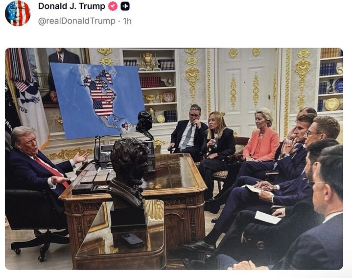 또 다른 사진에는 백악관 집무실에서 유럽 지도자들과 회동하는 장면이 담겼는데, 옆에 놓인 게시판에는 미국 본토를 비롯해 캐나다, 그린란드, 베네수엘라 전역이 성조기로 덮인 지도 이미지가 그려져 있다. 이는 지난 8월 유럽 정상들이 미국을 방문했을 당시 백악관 집무실에서 회담하던 사진을 수정한 것으로 보인다.