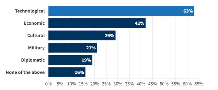 중국이 미국보다 뛰어난 점이 무엇인지 묻는 질문에 63%가 기술 분야를 꼽았다. 이는 민주당원의 74%, 무소속의 62%, 공화당원의 52%가 공감하는 견해였다.