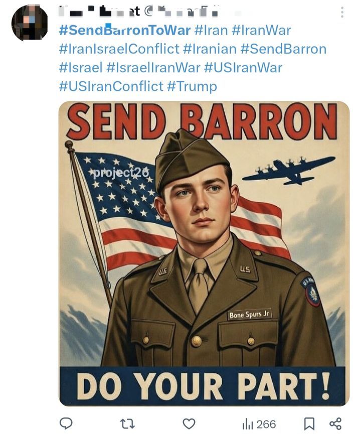 ]미국과 이스라엘의 대이란 군사작전으로 미군 사망자가 발생하자도널드 트럼프 대통령의 막내아들 배런 트럼프의 입대를 촉구하는 해시태그가 미국 사회관계망서비스(SNS)에서 확산하고 있다. (사진출처: 엑스 캡처)