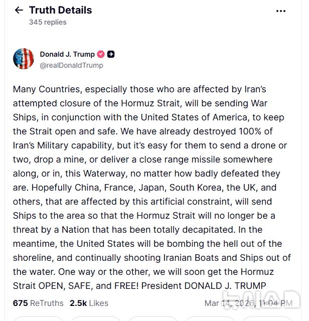 도널드 트럼프 미국 대통령은 14일(현지시간) 소셜미디어 한국과 중국, 일본, 영국, 프랑스 등 여러 나라에 이란으로부터 호르무즈 해협이 위협 받지 않도록 선박을 보내달라고 요구했다. 트럼프 대통령이 예고한 미국 군함 파견에 보조를 맞추라는 압박으로 풀이된다. (사진 = 트럼프 대통령 트루스소셜 갈무리) 2026.03.14 photo@newsis.com