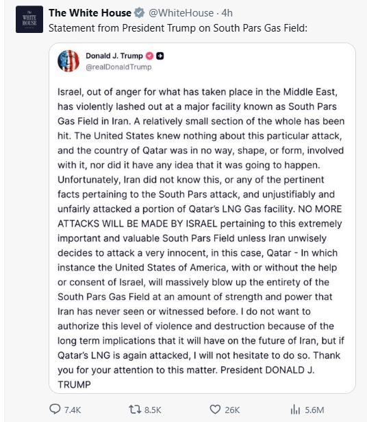 이는 이스라엘이 세계 최대 해상 가스전 가운데 하나인 사우스파르스를 미사일로 폭격하고, 이란이 세계 최대 LNG 수출 공장이 있는 카타르 라스라판에 보복 공격을 가하자 나온 발언이다. 이스라엘과 이란의 공방으로 브렌트유가 배럴당 110달러를 넘어서는 등 유가가 급등했다.