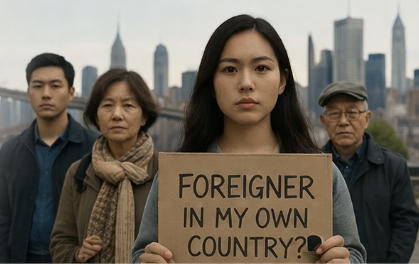 미국 사회에서 여전히 ‘외국인’으로 인식되는 현실을 상징적으로 보여주는 장면. 아시아계 미국인들은 출생지와 관계없이 일상 속 편견과 차별을 경험하고 있는 것으로 조사됐다. 사진 출처: 생성 이미지