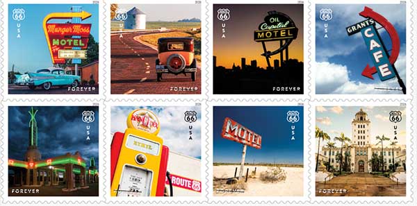 올해로 100주년을 맞은 상징적인 루트 66(Route 66) 를 기념해 연방 우정국(USPS)이 역사적인 도로를 담은 컬러 Forever 스탬프 세트를 발행한다.