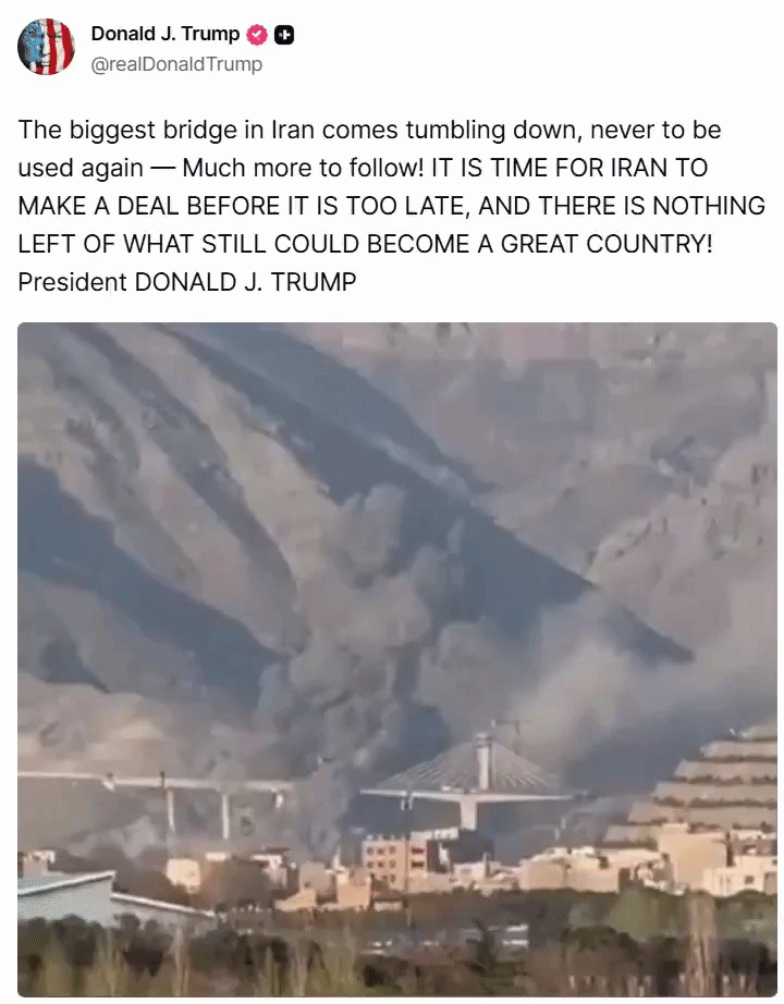 트럼프 대통령은 “이란의 가장 큰 다리가 무너져 다시는 사용하지 못할 것”이라며 “앞으로 더 많은 일이 뒤따를 것”이라고 경고했다.
