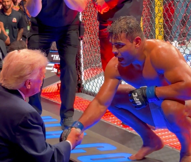 11일(현지 시간) 뉴욕타임스(NYT)에 따르면 트럼프 대통령은 이날 플로리다주 마이애미에서 마코 루비오 국무장관, 가족들과 함께 UFC 경기를 관람했다. 전 FBI(미 연방수사국) 부국장 댄 본지노, 팟캐스터 조 로건 등 측근들도 자리를 함께했다. 파울로 코스타가 UFC 327 경기에서 TKO 승리를 거둔 뒤 도널드 트럼프 대통령과 대화를 나누고 있다.Dan Scavino Jr. (X)