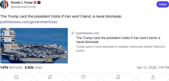 미국과 이란 간 평화 협상이 결렬된 후, 도널드 트럼프 미국 대통령이 이란에 대한 해상 봉쇄 가능성을 시사하는 기사를 공유해 주목된다.