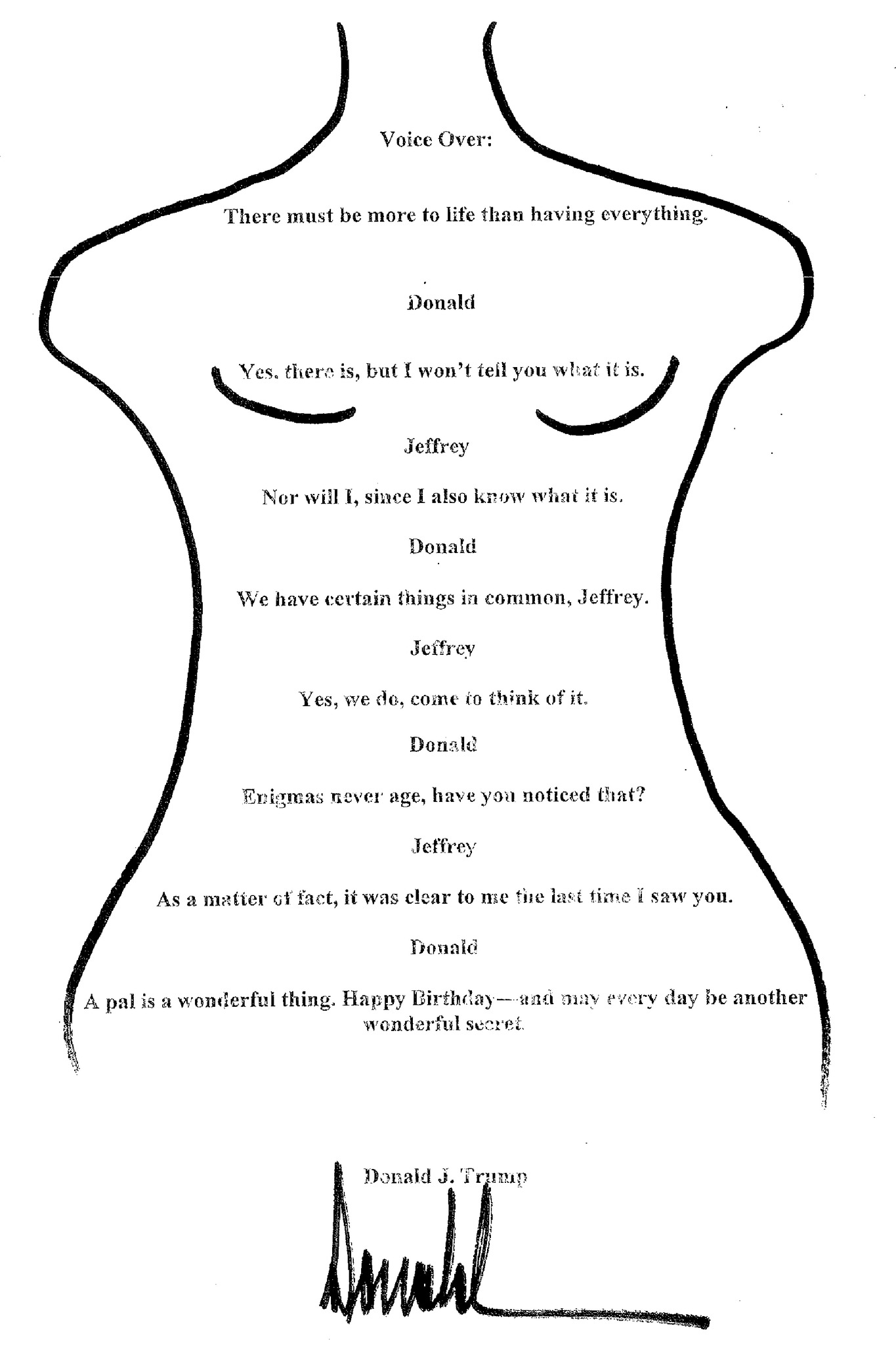 서한은 굵은 마커로 그린 여성의 나체 프레임 안에 손 글씨로 내용을 쓴 형태다. 여성의 가슴 부위가 곡선으로 표시되고, ‘도널드’라는 서명이 중요 부위 윗부분에 쓰여 체모를 암시하는 것처럼 보였다고 WSJ은 전했다.