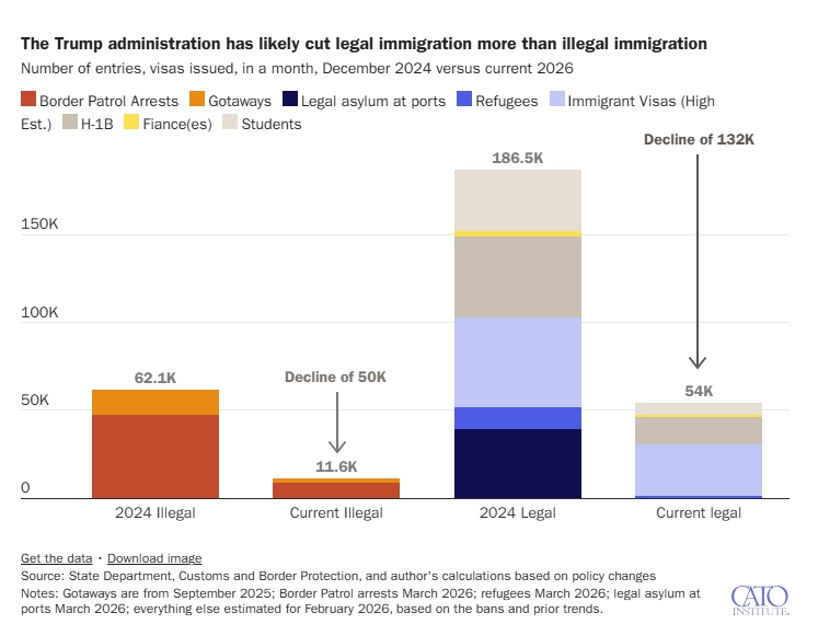 트럼프 행정부 출범 이후 불법 이민보다 합법 이민 감소 폭이 훨씬 큰 것으로 나타났다. 2024년 말 대비 현재 기준 합법 이민은 약 13만2천 명 감소한 반면, 불법 이민 감소는 약 5만 명 수준에 그친 것으로 분석됐다. 출처: Cato Institute