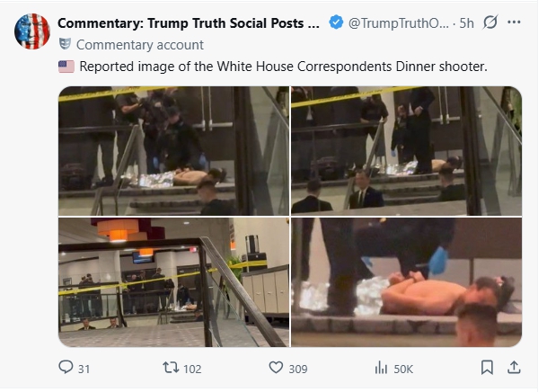 백악관 출입기자단 만찬 총격 사건 용의자가 보안요원에 의해 제압된 뒤 현장에서 체포되는 모습. 용의자는 총에 맞은 상태로 바닥에 쓰러져 있으며, 현장에는 통제선이 설치되고 무장 요원들이 배치됐다. (사진=Truth Social @TrumpTruthPost)