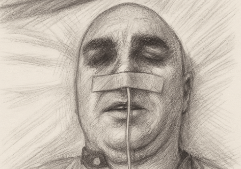 휴대전화 충전선을 산소 튜브로 위장해 암 투병을 가장한 모습. (AI 생성 이미지)