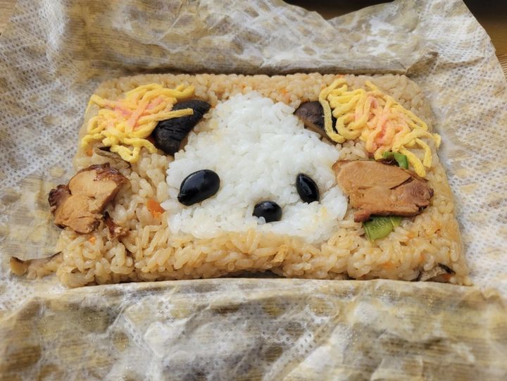 판다 얼굴은 흰 쌀밥으로 표현했고, 귀는 표고버섯, 눈과 코는 검은콩으로 만들어져 정감 있는 소박한 표정을 짓고 있다. 또 판다 얼굴 주변에는 계란 지단 등이 올려져 있다. 가격도 750엔(약 7000원)으로 비교적 저렴하다.