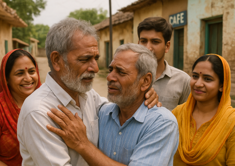 수십 년 전 교통사고로 기억을 잃었던 인도 남성 리키가 최근 또다시 머리를 다친 뒤 잃어버린 기억을 되찾아 가족들과 재회한 순간을 담은 모습. 기적 같은 상봉에 가족들이 서로를 부둥켜안고 눈시울을 붉히고 있다. AI 생성 이미지