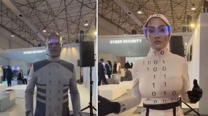 6일(현지시각) 이란 IT 전문 매체 줌잇 등에 따르면 최근 키시섬에서 열린 ‘키시 이녹스 테크 엑스포(Kish Inox Tech Expo)’ 행사장에 남녀 형태의 휴머노이드 로봇이 등장해 관람객들의 이목을 끌었다. 두 ‘로봇’은 이진 코드(0·1) 무늬의 의상을 입고 기계적인 동작을 연출했다.