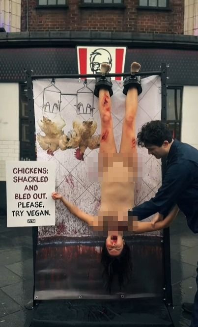 영국 런던의 한 KFC 매장 앞에서 비건(채식주의)을 지지하는 동물권 운동가들이 여성을 거꾸로 매달아 놓고 목을 베는 시늉을 하는 시위를 펼쳐 이목을 끌었다.