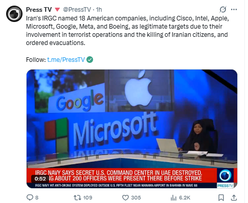 혁명수비대는 18개 기업을 “전쟁 조장 정권과 연계된 첩보기관”으로 규정하며 “이들은 인공지능(AI)과 정보통신기술(ICT) 서비스로 미국·이스라엘의 이란 내 테러와 암살 대상 추적에 핵심 역할을 했다”고 주장했다.