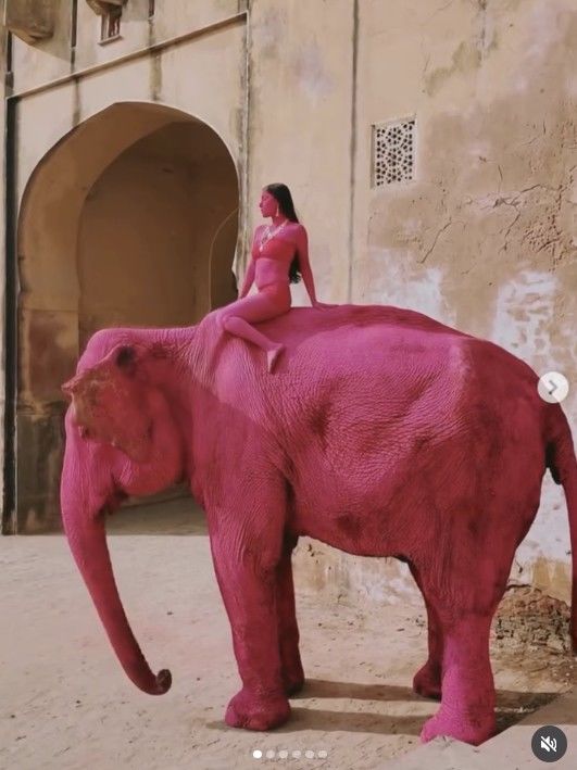 그는 지난해 11월 65세 코끼리를 밝은 분홍색으로 칠한 뒤, 같은 색으로 몸을 물들인 모델을 코끼리 위에 앉힌 채 폐허가 된 힌두 사원에서 촬영을 진행했다.