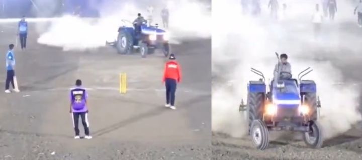 인도의 국민 스포츠 ‘크리켓’ 경기 도중 한 남성이 트랙터를 몰고 경기장에 난입하는 일이 벌어졌다. (사진=SNS 갈무리)