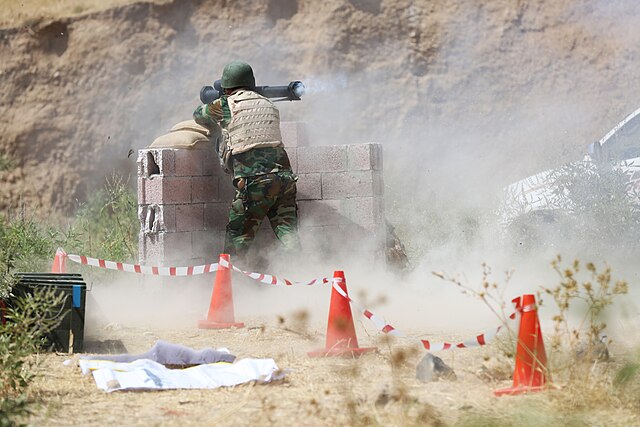 쿠르드 페슈메르가 병사가 판처파우스트-3 대전차 로켓 발사기를 발사하고 있다. 사진 미 육군 Sgt. Kalie Jones