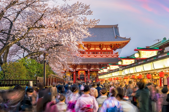 Tourists at shopping street in Asakusa, Tokyo, Japan with sakura trees [어도비스탁 자료사진]