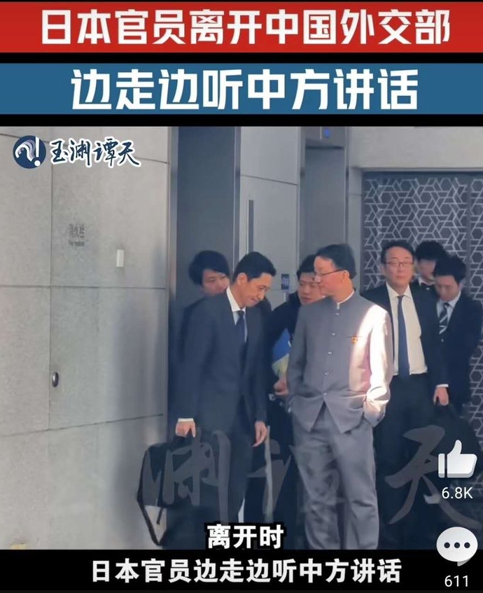 중국중앙(CC)TV 산하 소셜미디어(SNS) 계정인 위위안탄톈(玉淵潭天)은 18일 류진쑹 외교부 아주사장(아시아국장)과 가나이 마사아키 일본 외무성 아시아대양주국장이 베이징에서 회담을 진행한 이후의 모습이 담긴 듯한 영상을 현지 SNS 웨이보에 게재했다. 해당 영상에는 중국과 일본 당국자의 상반된 행동이 담긴 모습이 눈에 띈다.(사진=위위안탄톈 웨이보 계정 갈무리) 2025.11.18 photo@newsis.com