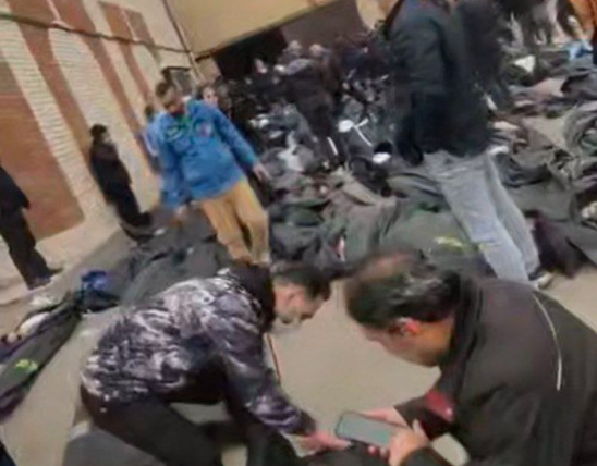 11일 테헤란 카흐리자크 지역의 임시 영안실 밖에 있는 대형 의료 창고 영상 속에는 시신을 담은 자루들이 창고 안과 인접한 마당에 쌓여 있었다.