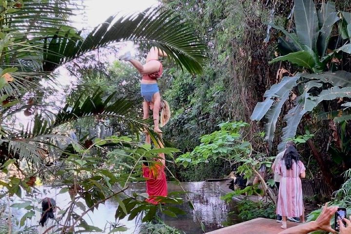 태국 왓파랏 사찰에서 관광객이 노출이 심한 옷을 입고 ‘아크로 요가’를 하고 있다. (사진=페이스북 캡처)