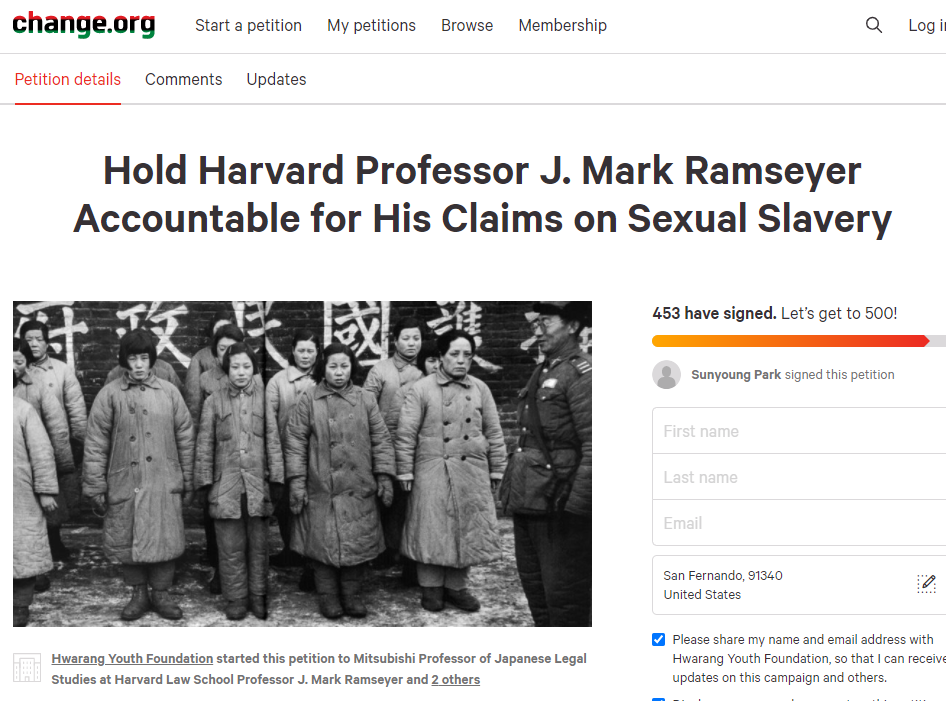 18일 화랑 청소년들은 청원사이트 ‘change.org’에 올린 청원에서 램지어 교수의 논문이 잔악무도한 일본 전범들의 범죄를 합리화하고 역사를 왜곡하는 것이라며, 이 논문을 취소하고 역사를 바로잡지 않는다면 20만명에 달하는 위안부 피해자 할머니들은 매춘부로 세계 역사에 남는 뼈아픈 고통을 겪게 될 것이라고 지적했다.