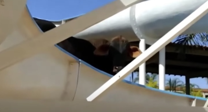 브라질에서 도축장을 탈출한 소 한 마리가 카메라맨을 응시하며 워터파크에서 미끄럼틀을 탔다.
