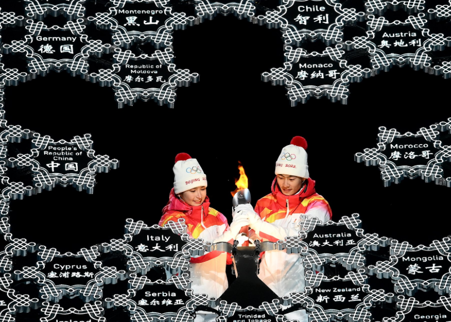 마지막에 성화를 받은 선수는 중국의 2000년대생 유망주였다. 이번 대회 남자 노르딕복합에 출전하는 자오자원과 여자 크로스컨트리 스키에 나서는 이라무장이었다. 2001년에 태어난 두 선수는 나란히 성화를 들고 경기장 내를 달리다가 커다란 눈꽃송이 조형물 가운데 설치된 안치대에 성화봉을 꽂았다.